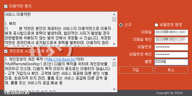 Multi Remote Desktop Release notes 접속 주소 : http://rd.dsun.kr/ Multi Remote Desktop 소개 : http://www.dsun.kr/79 ▶ 2019년 01월 03일 업데이트 (ver 1.0.0.0) - Atomus Framework로 리뉴얼 - 서버 리..