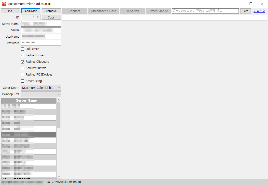 그래서 !! 몇년 동안 개발중인 프레임워크로 Multi Remote Desktop를 업그레이드 하였습니다. 최종적으로 사용하는 메인 화면은 기존과 거의 비슷합니다.