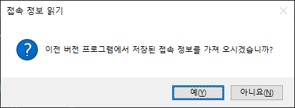 로그인이 정상적으로 되고 기존 프로그램의 서버 리스트 파일이 존재하면 아래와 같은 메시지가 뜹니다. 예(Y)를 클릭하면 기존에 파일 형태로 저장된 서버 리스트를 불러와 저장합니다(RDP.dat 파일은 old_RDP.dat로 변경이 되어 백업됨).